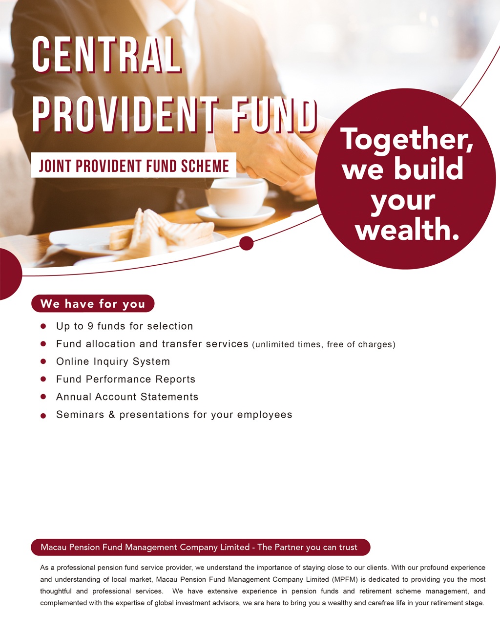 This system came into force on 1 January 2018, aiming to strengthen the social protection for the residents of the Macao SAR in their old age after retirement. It consists of two main schemes. “Joint Provident Fund Scheme” and “Individual Provident Fund Scheme”.